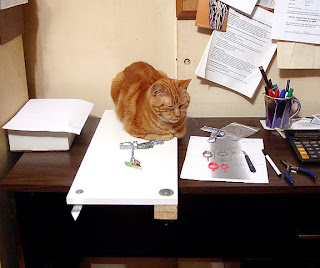 Later I went back into the ofice because I realized I had forgotten to put everything away . . . and there was Sam, ahem, "guarding" the new wax for David's ring!